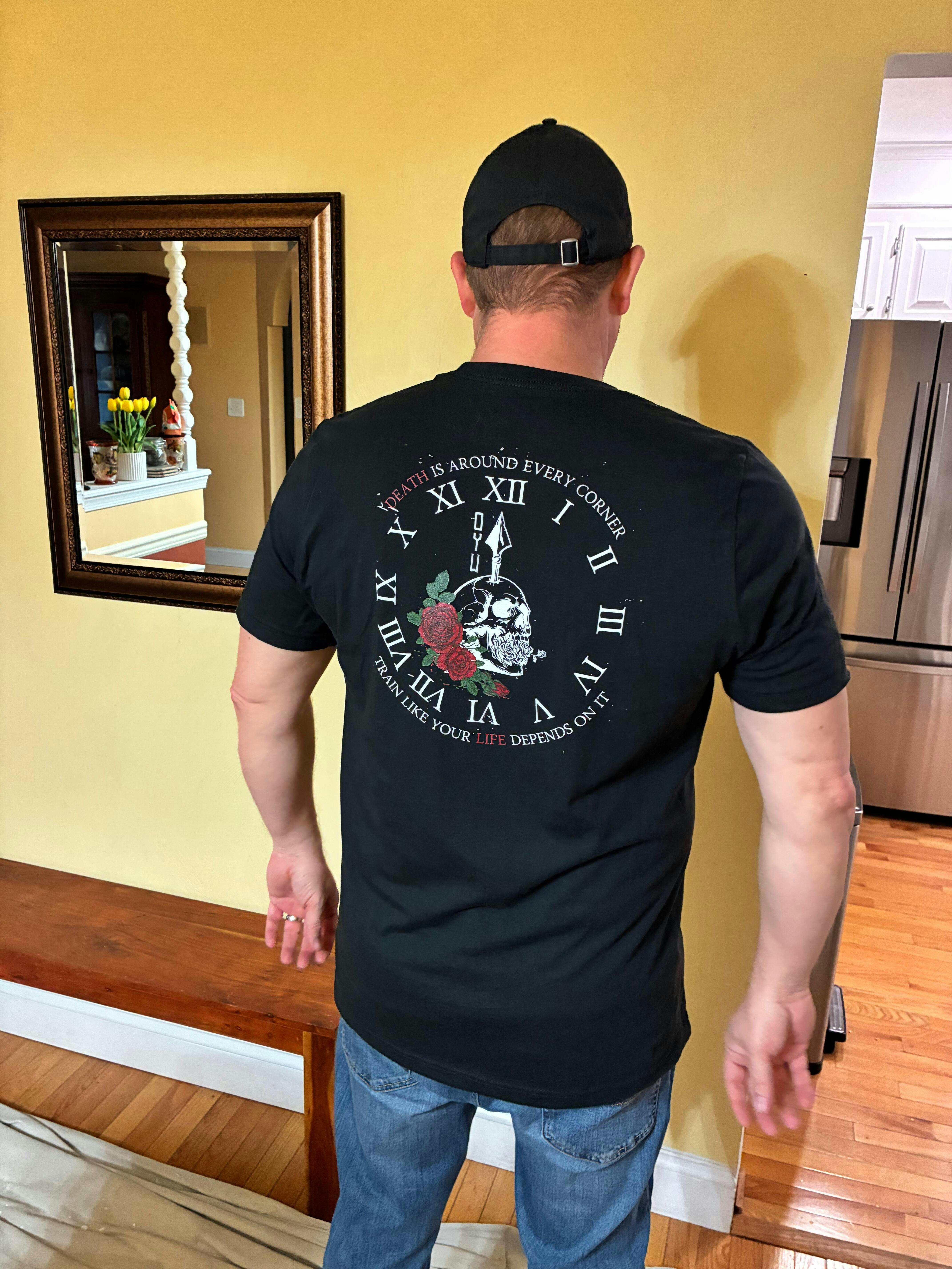 his design features a skull pierced by a spear overlaid on a clock—a stark reminder that death is around every corner and time is never wasted.